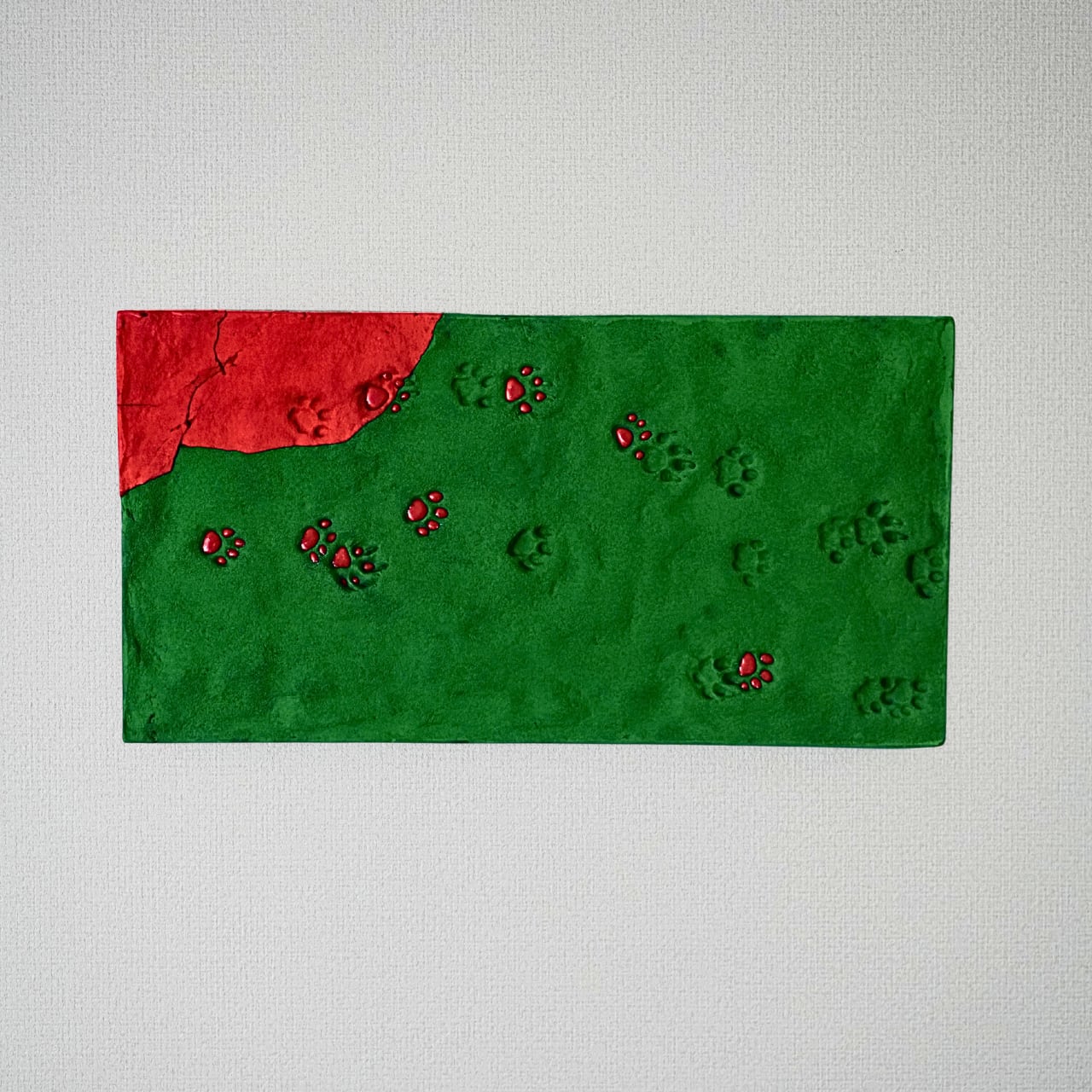 肉球の凹みと赤い色だけで、猫の気配と物語を感じられる構成になっています。